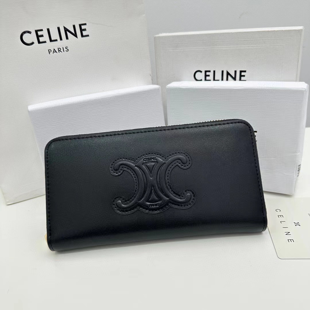 Celine P90 A13 19 10 TRIOMPHE CUIR 12 Large Wallet. Material: Calfskin. Hardware: Gold-tone hardware. Pattern: Monogram. Style: Top handle, Crossbody, Shoulder, Backpack, Clutch, Tote, Bucket. Color: Black. Condition: Brand new. Includes: Box, Shoulder strap. Size: 1.9 x 1.1 x 0.2 cm.