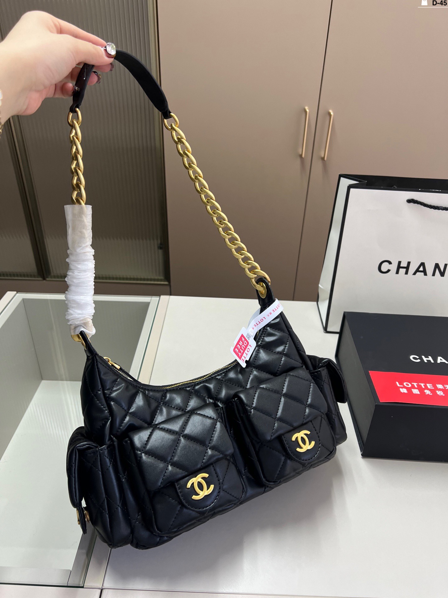 Chanel p170 D-45 25 14 Jennie hobo Bag. Material: Calfskin. Hardware: Gold-tone hardware. Pattern: Monogram. Style: Top handle, Crossbody, Shoulder, Backpack, Clutch, Tote, Bucket. Color: Black. Condition: Brand new. Includes: Box, Shoulder strap. Size: 1.9 x 1.1 x 0.2 cm.