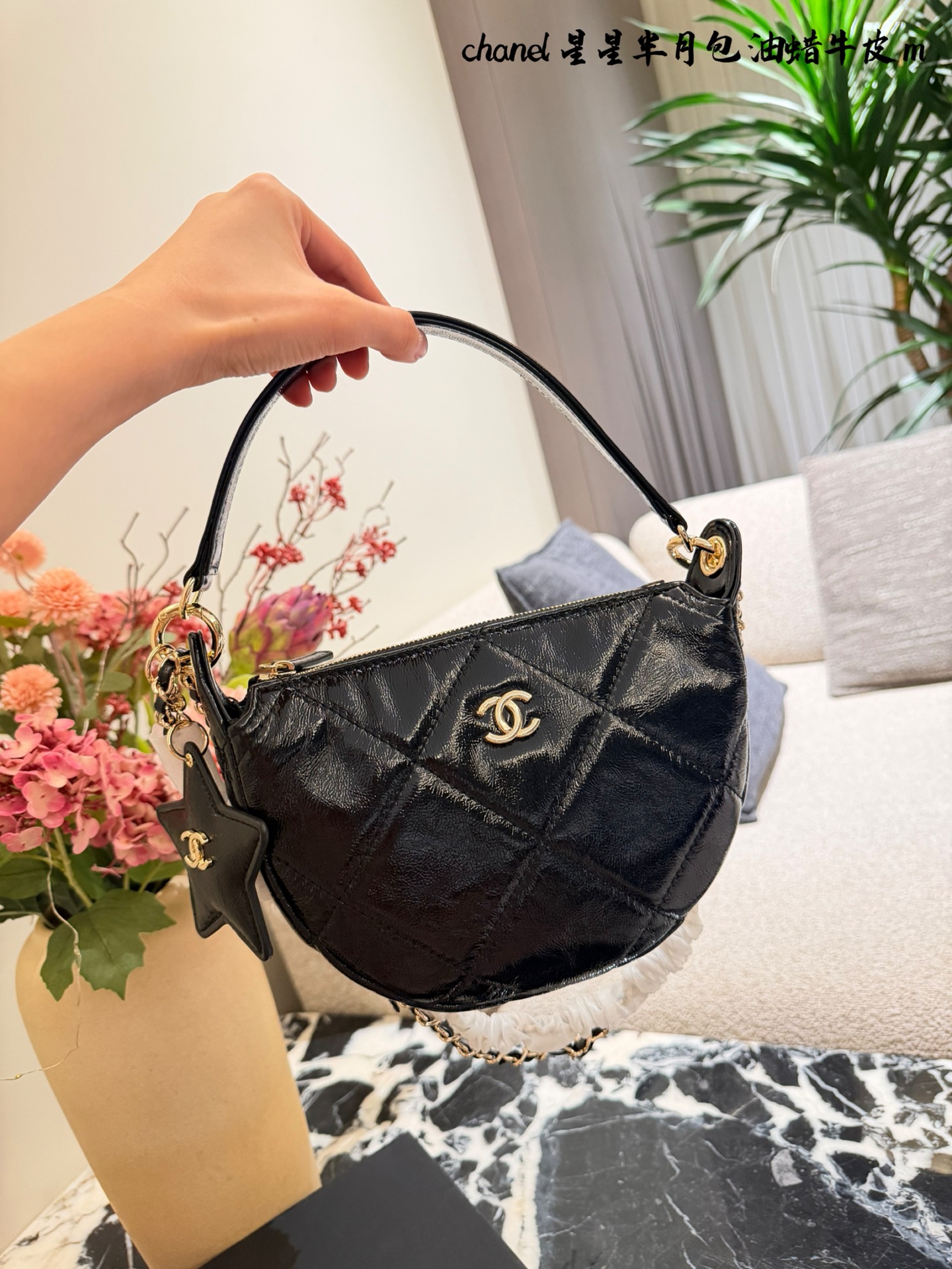 Chanel p190 OK Bag. Material: Calfskin. Style: Top handle, Crossbody, Shoulder. Color: Black. Includes: Shoulder strap. Size: 20 cm.