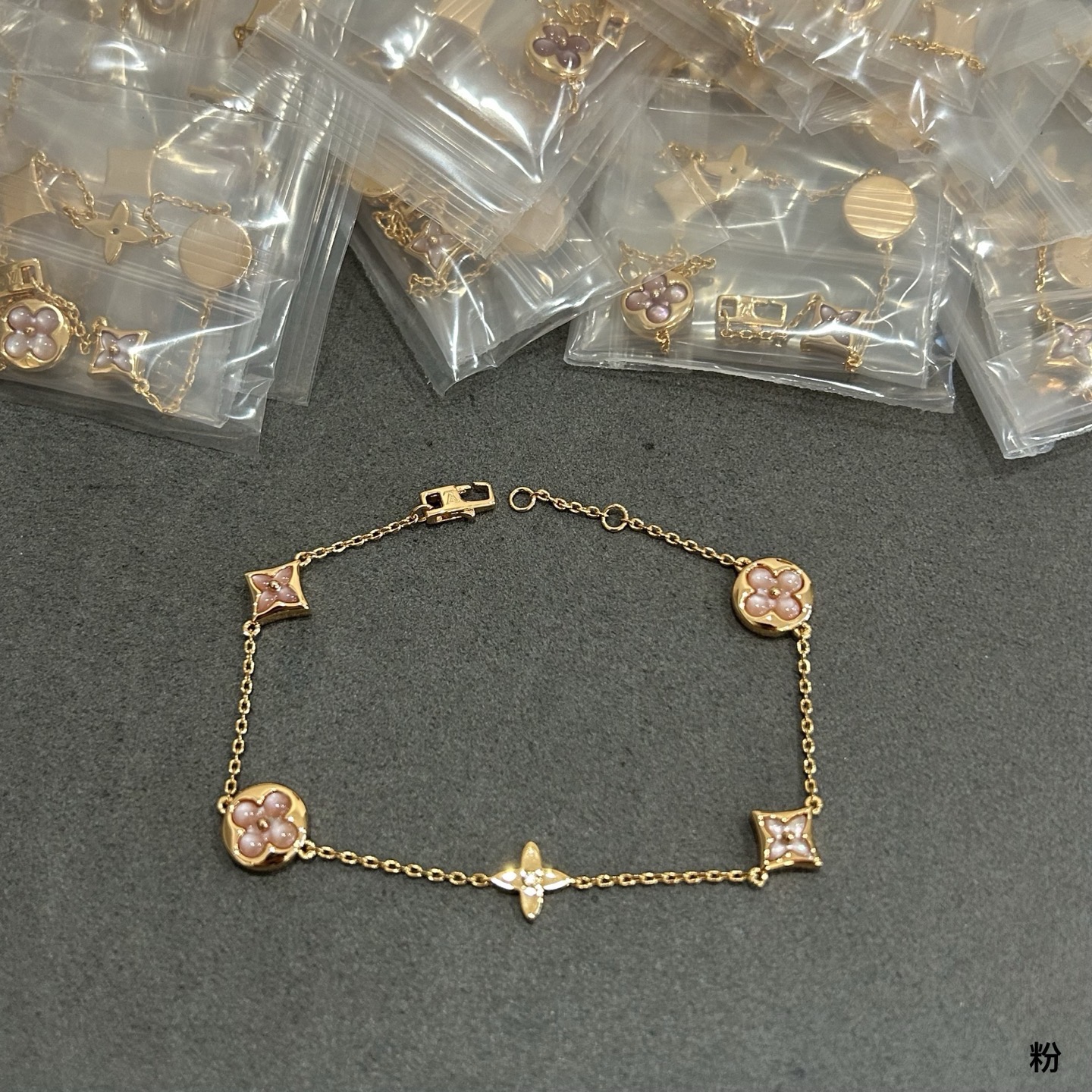 An elegant gold-tone bracelet featuring Louis Vuitton’s signature Monogram flower motifs adorned with pink mother-of-pearl inlays. This delicate chain bracelet combines the iconic LV star and flower symbols for a refined, feminine aesthetic.