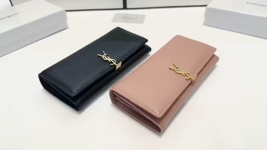 Elegant long wallets featuring the iconic YSL monogram clasp in gold-tone hardware. Crafted in supple grained leather, these sophisticated accessories offer timeless luxury and practical functionality.