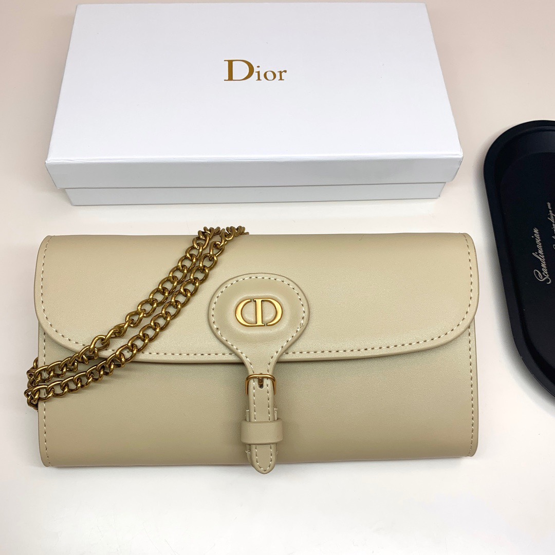 An elegant cream-colored leather wallet on chain featuring the iconic CD logo clasp and a detachable gold-tone chain strap. This versatile accessory transitions seamlessly from day to evening with its refined silhouette and luxurious craftsmanship.