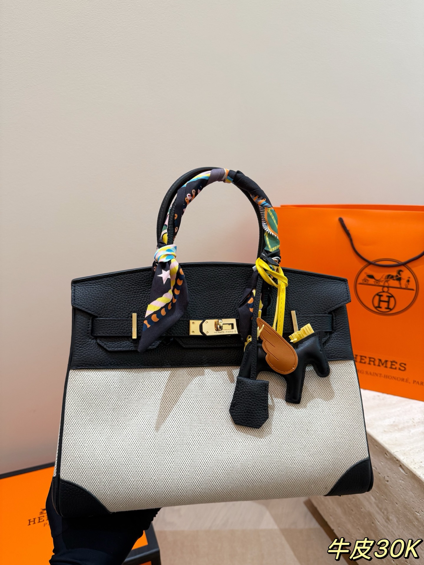 An iconic Hermes Birkin handbag featuring a sophisticated two-tone design in black leather and natural canvas with gold-tone hardware. The signature silhouette is elegantly accented with a colorful silk scarf tied to the handle and an exclusive Rodeo charm.