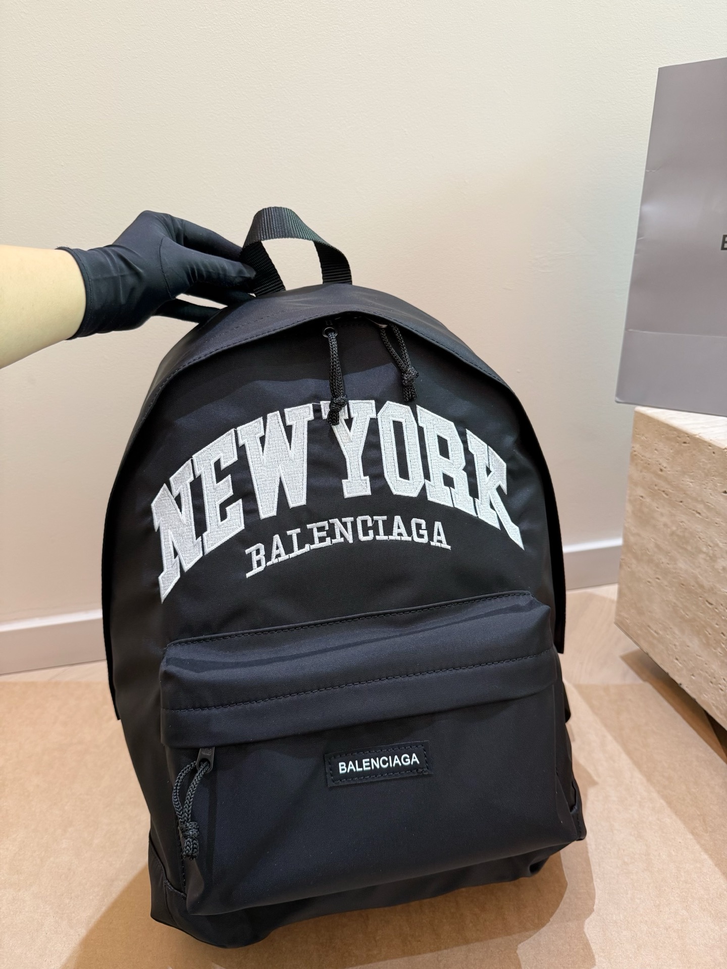 A sleek black nylon backpack featuring bold white collegiate-style ‘NEW YORK’ lettering with Balenciaga branding. This urban-inspired design combines streetwear aesthetics with luxury craftsmanship, perfect for everyday sophistication.