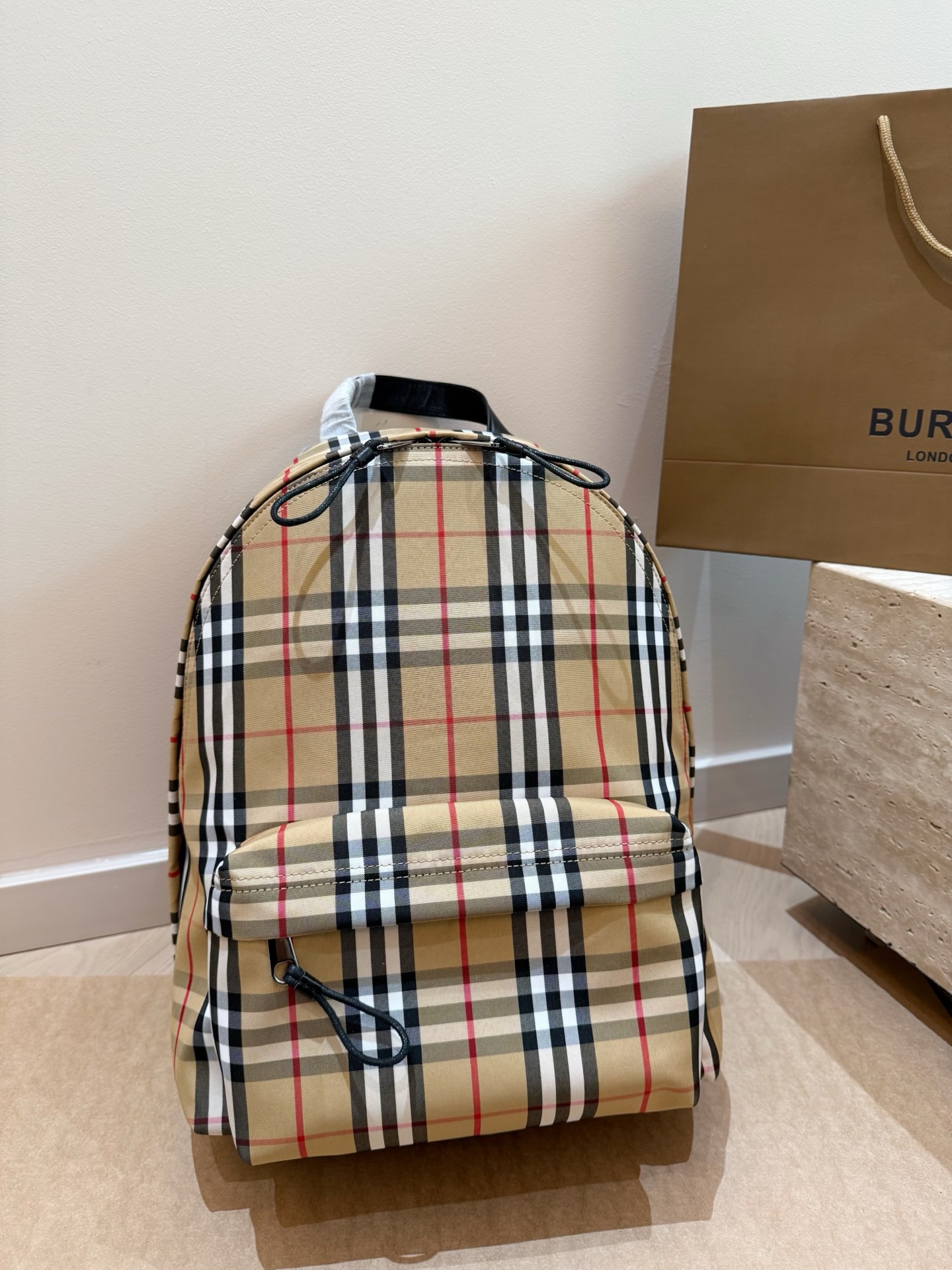 A sophisticated backpack featuring Burberry’s iconic Vintage Check pattern in beige with black, white, and red stripes. Crafted with premium materials and black leather trim, this versatile piece combines British heritage with contemporary functionality.