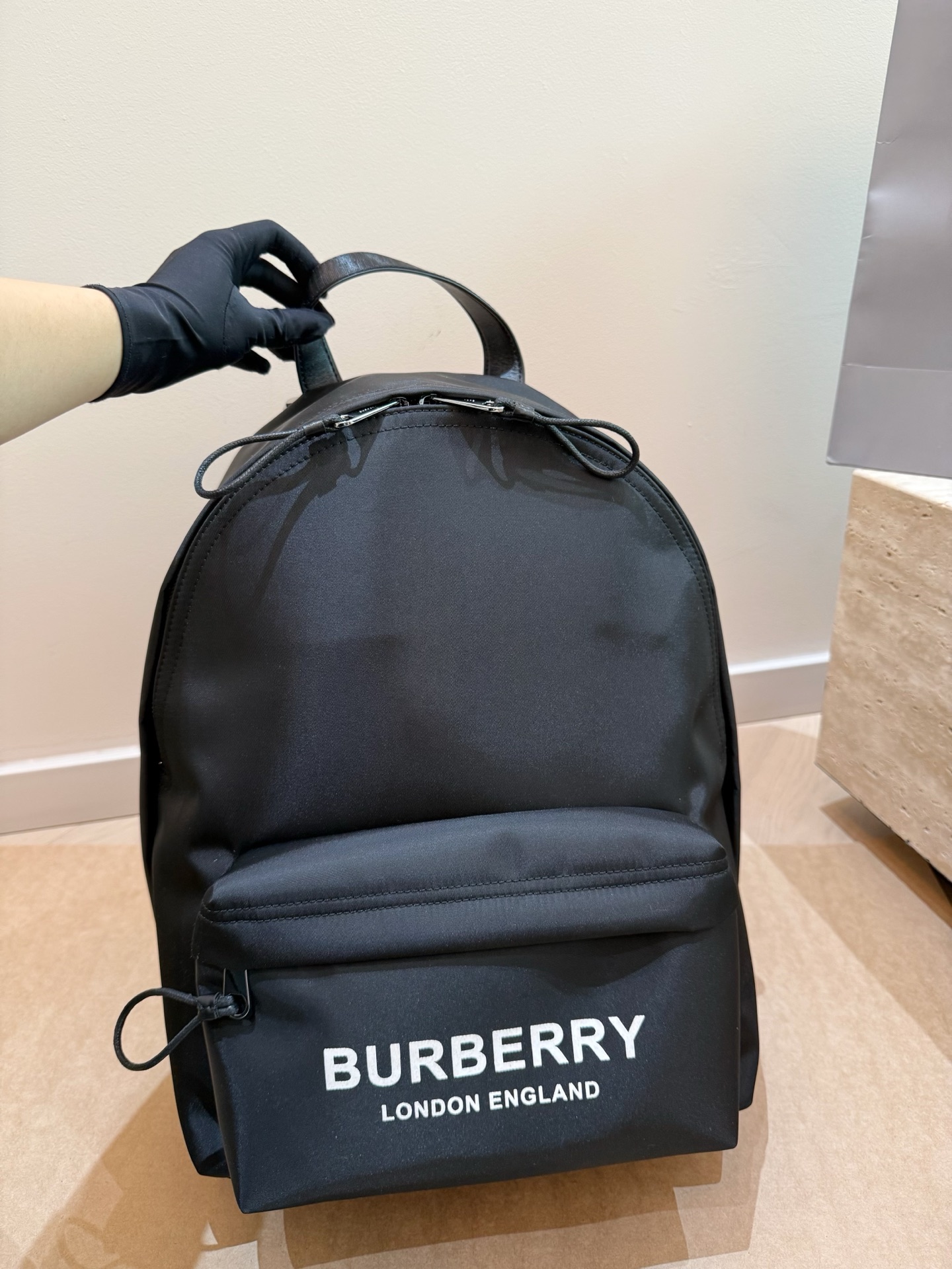 A sleek black nylon backpack featuring the iconic Burberry London England logo in bold white lettering. This contemporary design combines British heritage with modern functionality, perfect for everyday luxury.