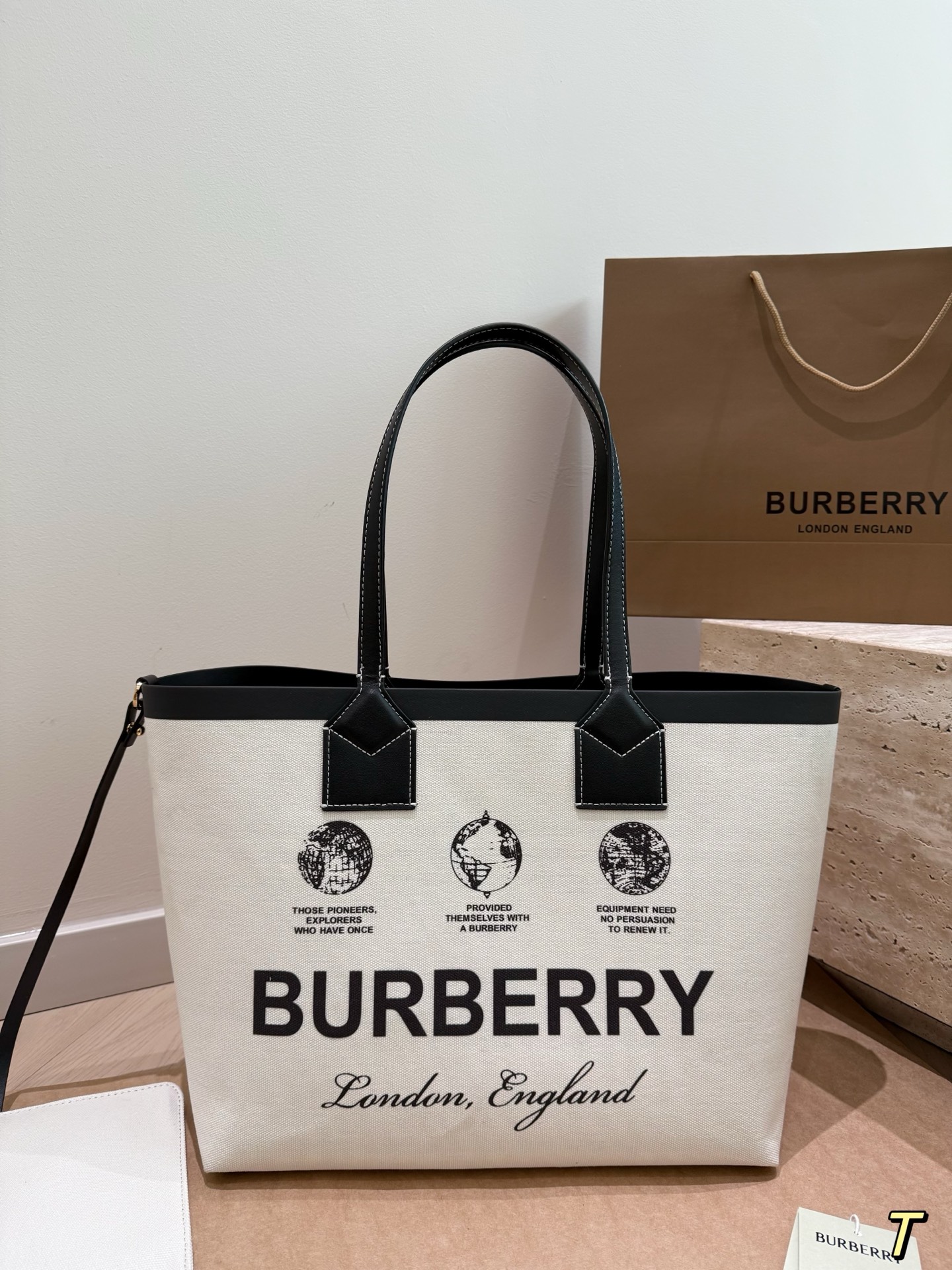 A sophisticated canvas tote bag featuring the iconic Burberry logo and heritage graphics with contrasting black leather handles and trim. This spacious everyday bag combines British luxury with practical functionality.
