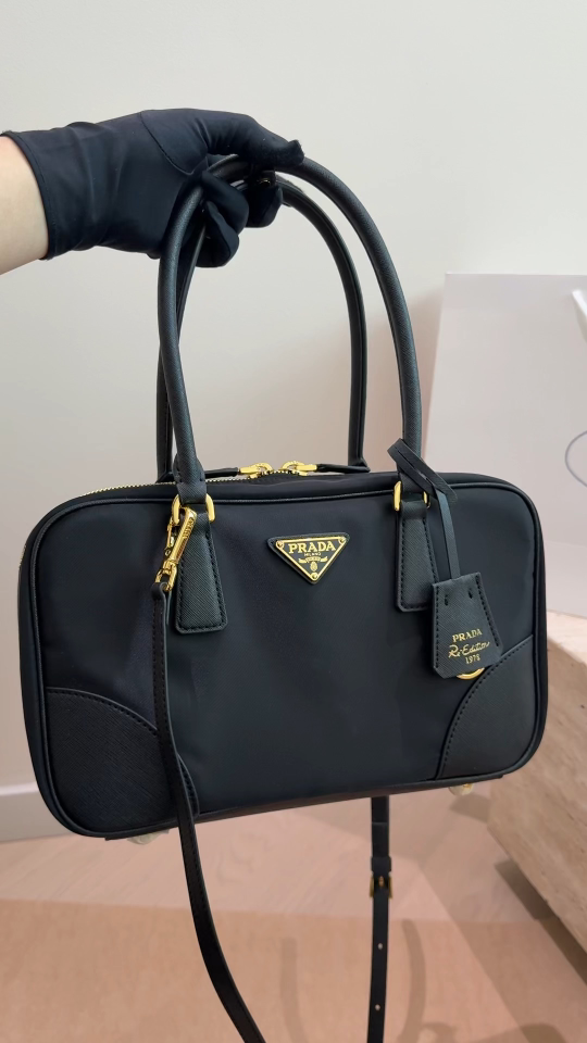 A sophisticated black Prada handbag featuring the iconic triangular logo plaque and gold-tone hardware. Crafted with a structured silhouette and dual top handles, this timeless piece includes a detachable shoulder strap for versatile carrying options.