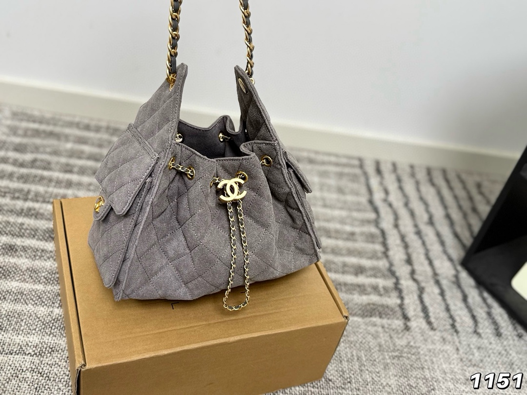 A sophisticated quilted suede bucket bag featuring the iconic CC logo charm and gold-tone chain strap. The drawstring closure and luxurious gray suede finish make this an elegant everyday accessory.