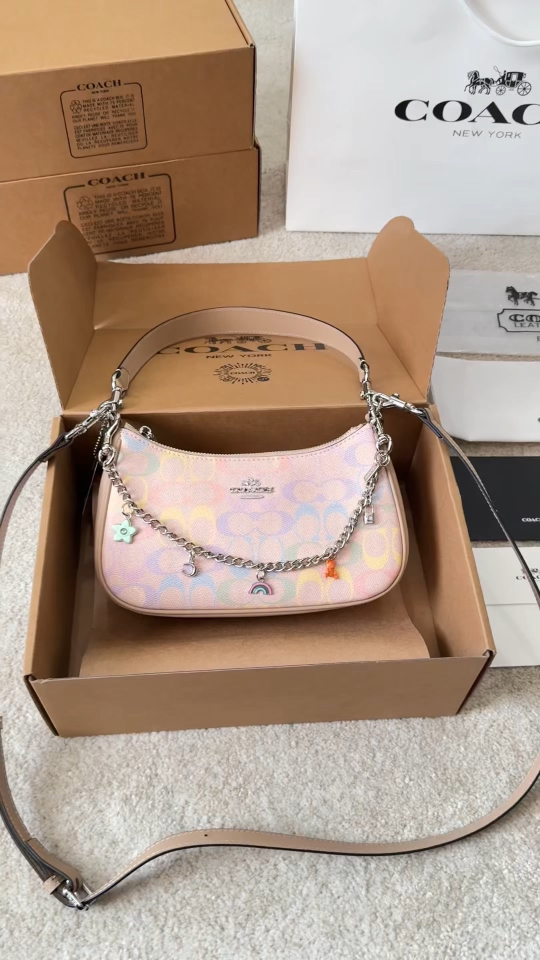 A chic Coach shoulder bag featuring an iridescent pastel finish with playful charm accents and silver-tone chain detailing. This versatile piece combines modern style with the brand’s signature craftsmanship, perfect for adding a touch of whimsy to any outfit.