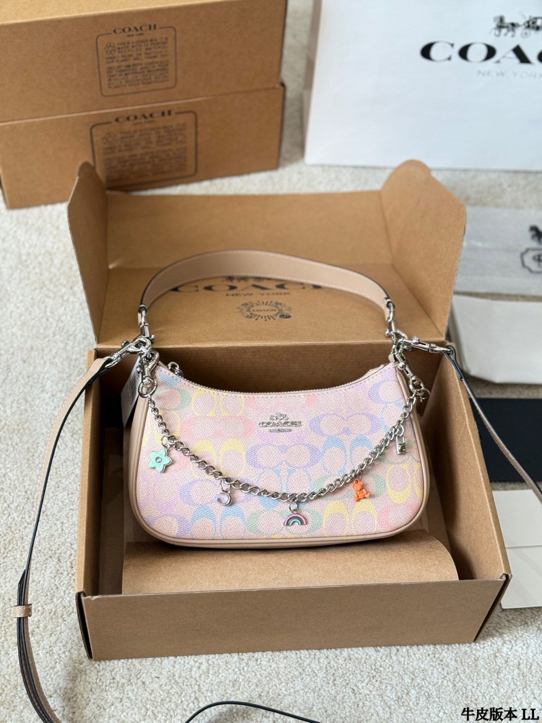A playful shoulder bag featuring Coach’s signature pastel floral print with charming rainbow and flower charms on a decorative chain. This versatile piece combines youthful elegance with practical everyday functionality.