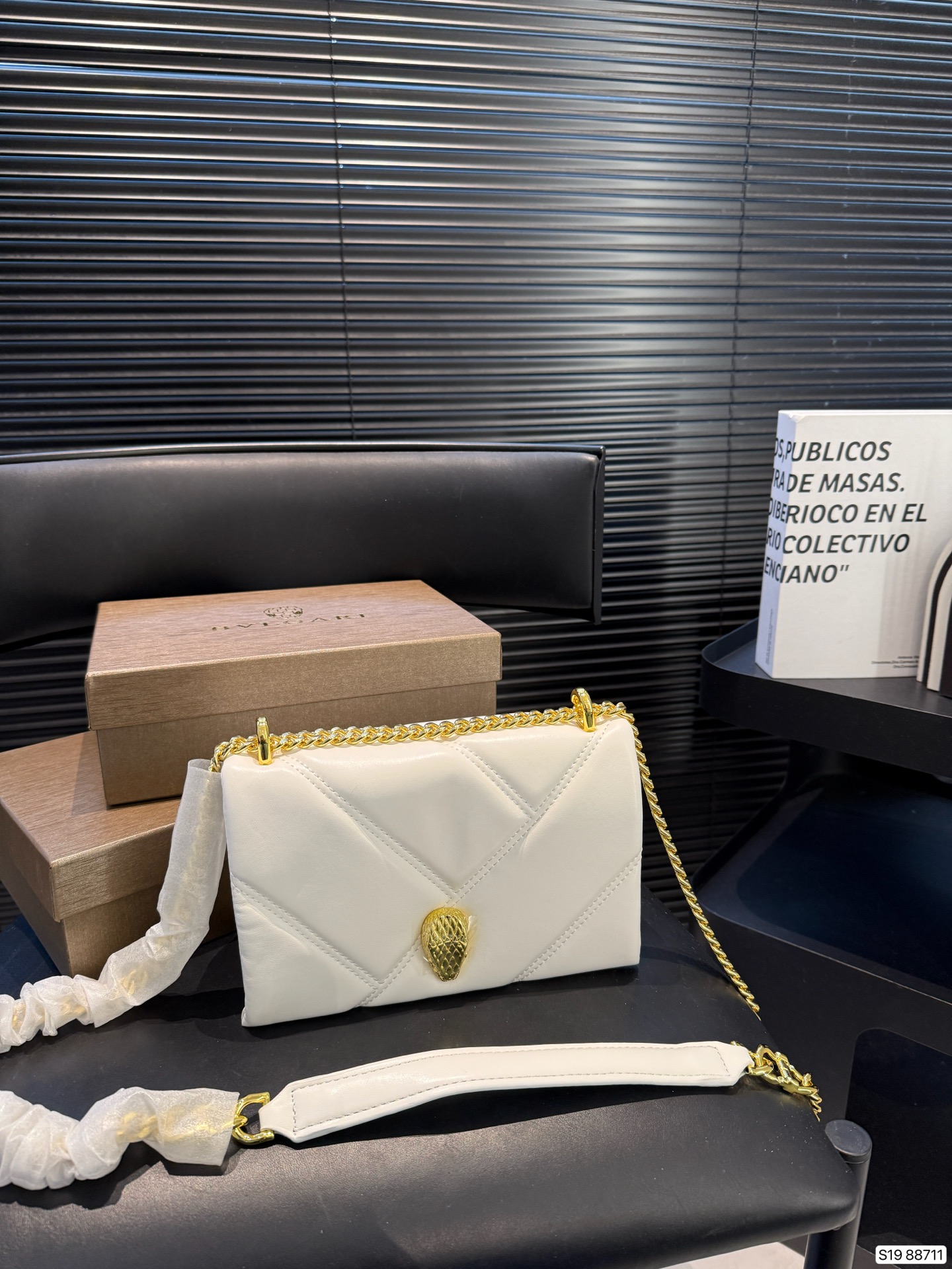 A sophisticated white quilted leather shoulder bag featuring the signature eagle head emblem in gold-tone hardware. The elegant chevron stitching and chain strap with leather detail create a timeless accessory perfect for day-to-evening wear.