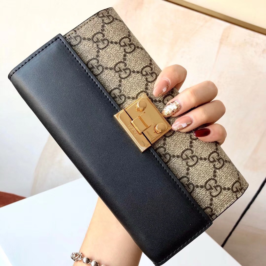 A sophisticated Gucci wallet featuring the iconic GG Supreme canvas paired with smooth black leather and an elegant gold-tone turn-lock closure. This timeless accessory combines heritage craftsmanship with modern functionality for everyday luxury.