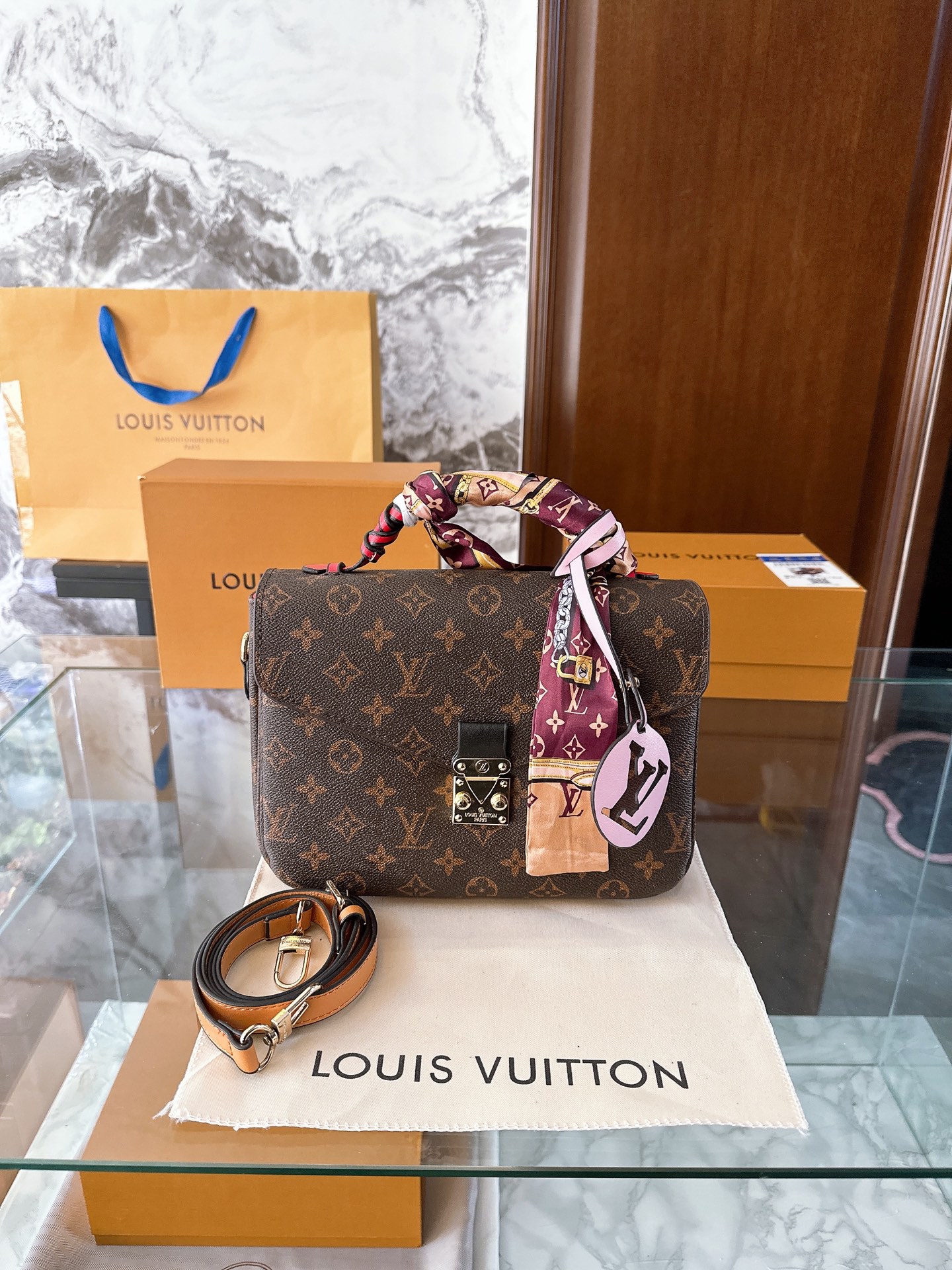This iconic Louis Vuitton Métis shoulder bag features the signature monogram canvas with a distinctive S-lock closure and comes with a removable leather strap and decorative scarf. A timeless piece that combines classic elegance with modern versatility, perfect for everyday luxury.