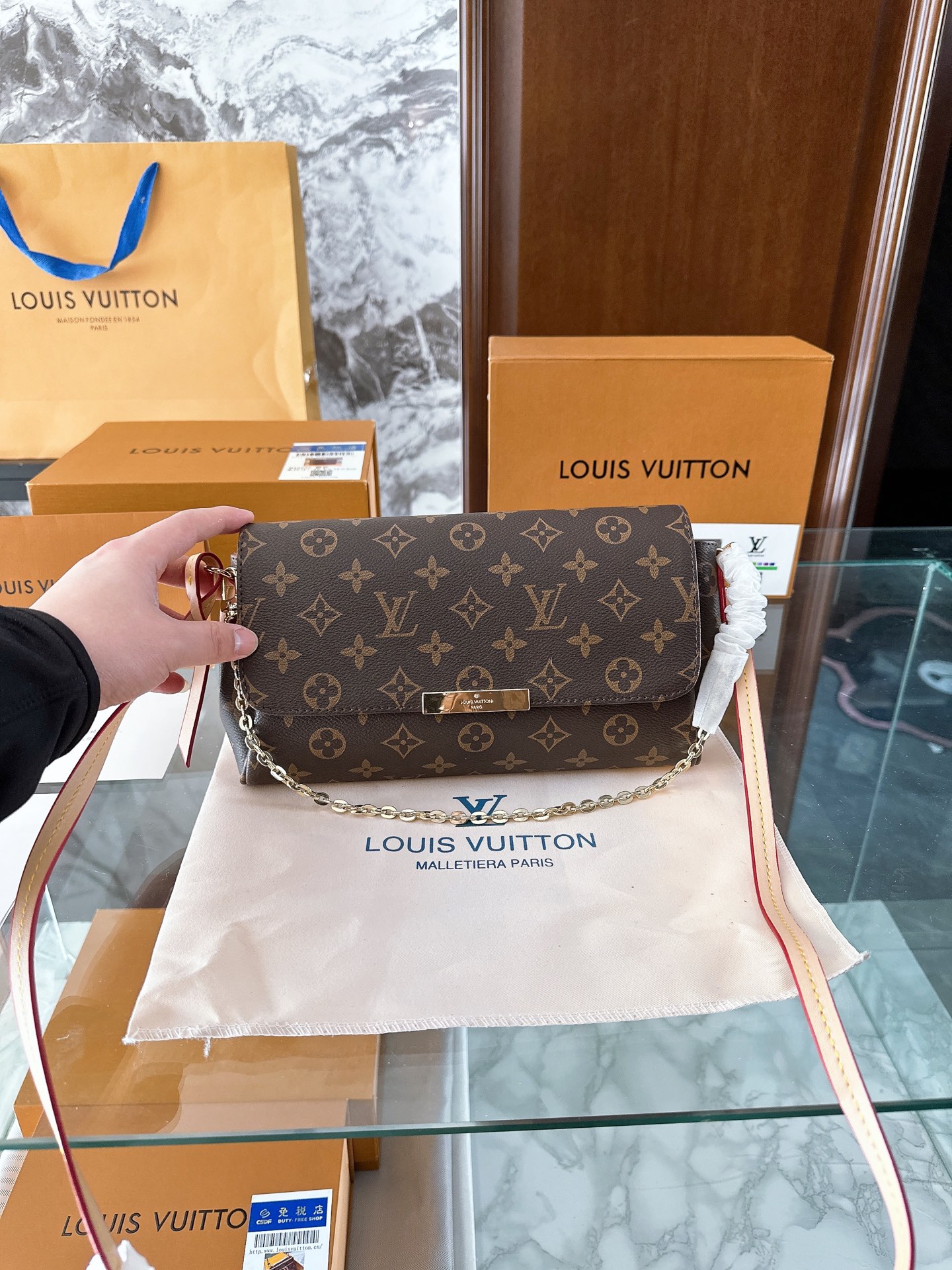 This elegant shoulder bag features the iconic Louis Vuitton monogram canvas with a chain strap and gold-tone hardware. A timeless accessory that combines classic design with versatile functionality for everyday luxury.