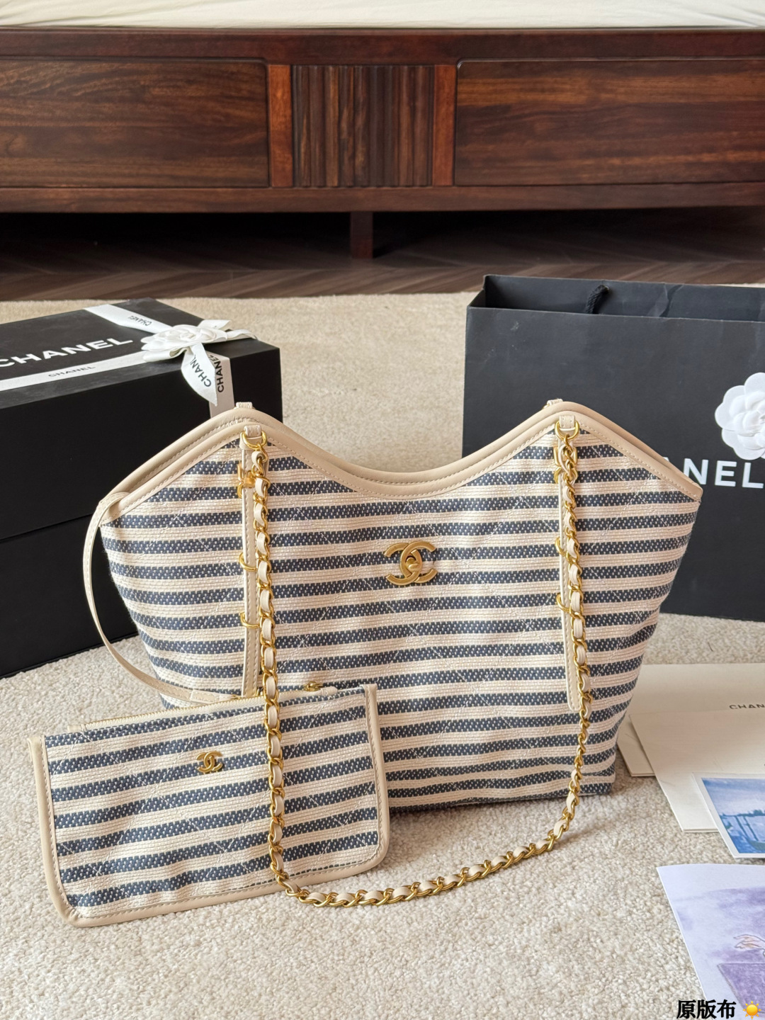 A timeless Chanel tote bag featuring navy and beige striped canvas with signature gold-tone CC logo and chain-link shoulder straps. This elegant everyday bag combines nautical-inspired design with the house’s iconic luxury craftsmanship.