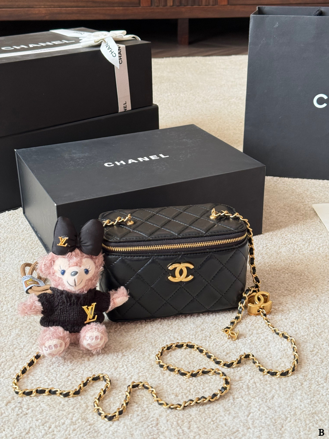A sophisticated black quilted leather belt bag featuring the iconic CC logo in gold-tone hardware and a chain strap. This versatile piece combines Chanel’s timeless elegance with modern functionality, perfect for hands-free luxury.