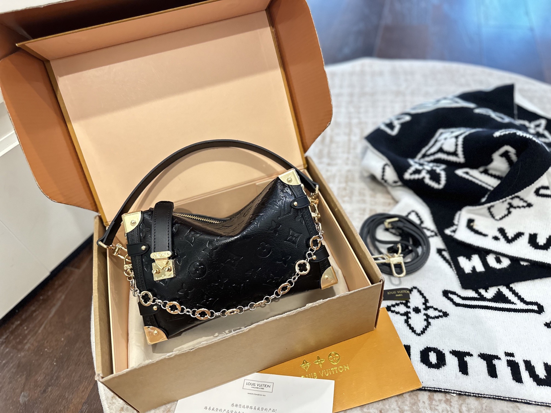 A sophisticated black embossed leather shoulder bag featuring signature monogram detailing and gold-tone hardware. This elegant piece combines timeless design with versatile functionality, complete with a chain strap and top handle for multiple carrying options.