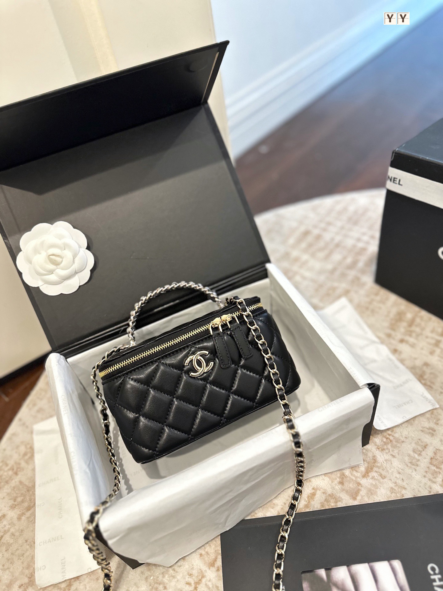 A sophisticated black quilted leather crossbody bag featuring the iconic CC logo and elegant chain strap. This compact design combines timeless Chanel craftsmanship with modern functionality, perfect for day-to-evening wear.