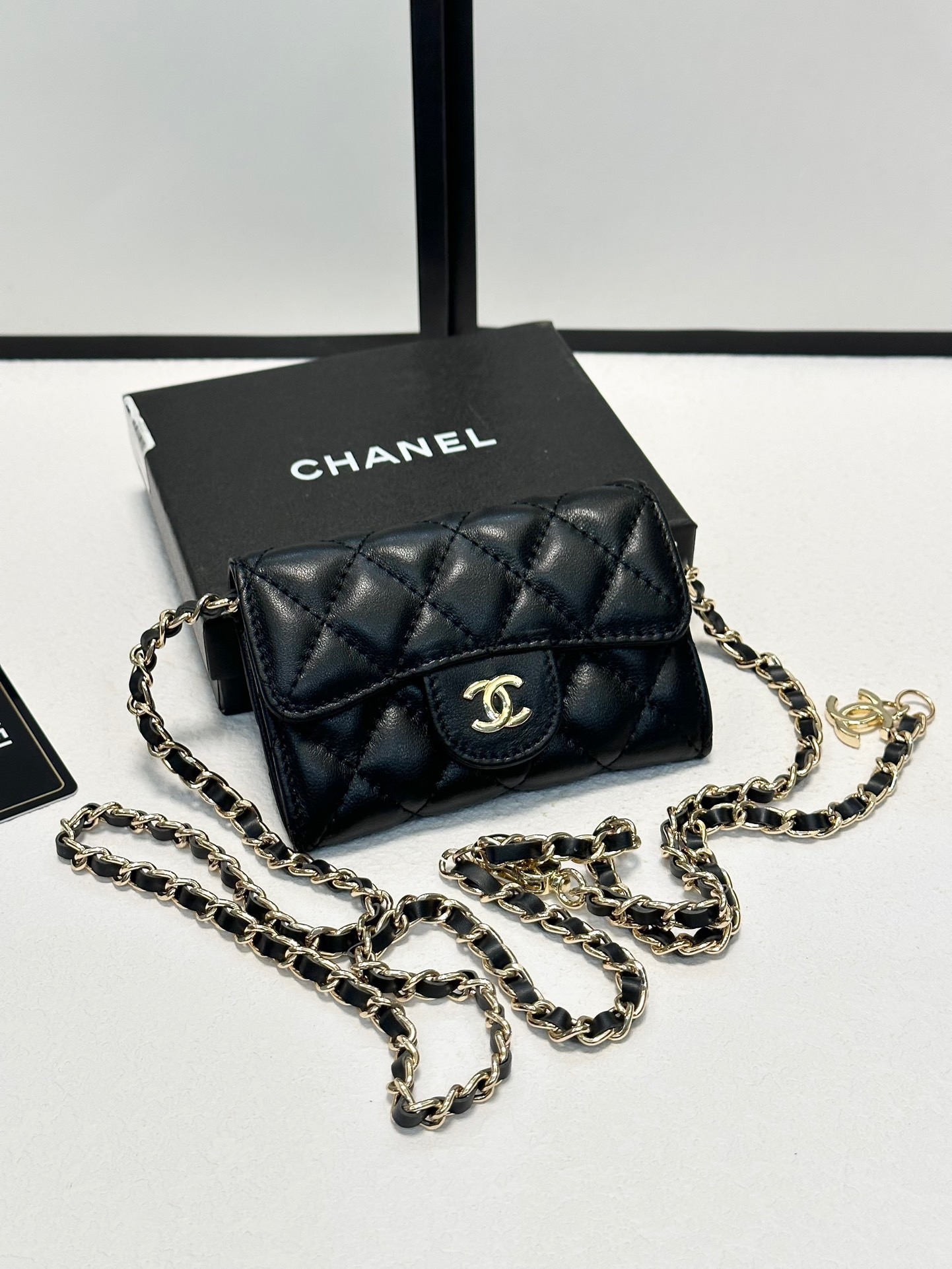 A compact quilted black leather crossbody bag featuring the iconic interlocking CC logo and elegant gold-tone chain strap. This timeless Chanel piece combines sophisticated craftsmanship with everyday versatility.