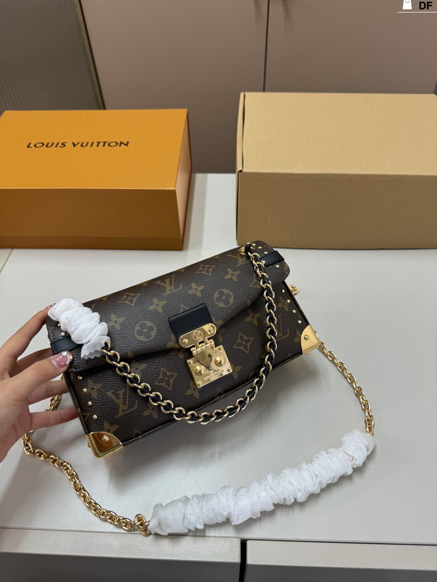 A compact Louis Vuitton crossbody bag featuring the iconic monogram canvas with gold-tone hardware and chain strap. This elegant piece combines timeless design with modern functionality, perfect for day-to-evening wear.