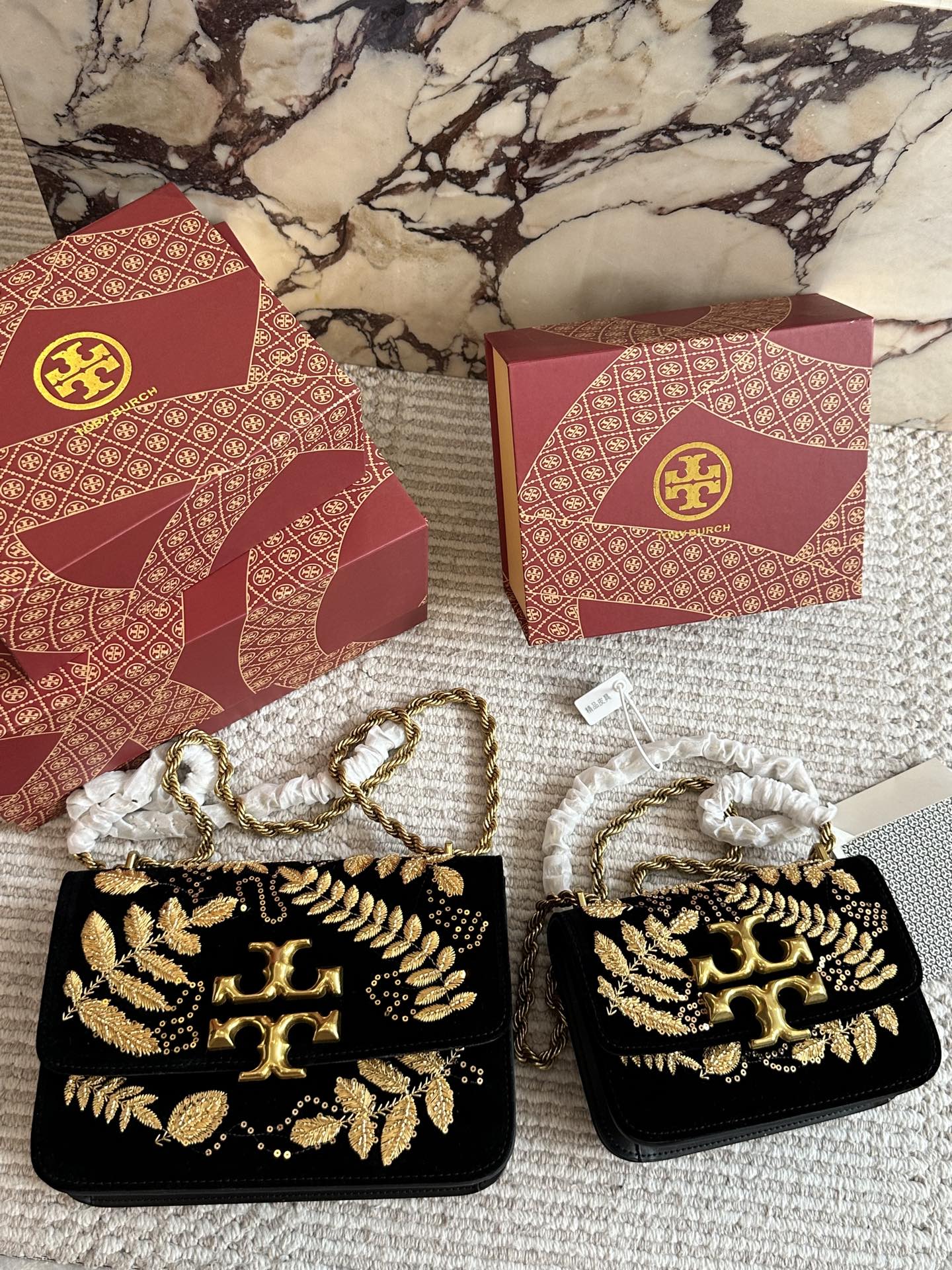 A luxurious black velvet shoulder bag adorned with intricate gold embroidered fern motifs and crystal embellishments, featuring the signature double-T logo hardware and a sophisticated chain strap. This statement piece combines rich texture with botanical elegance for an elevated evening look.
