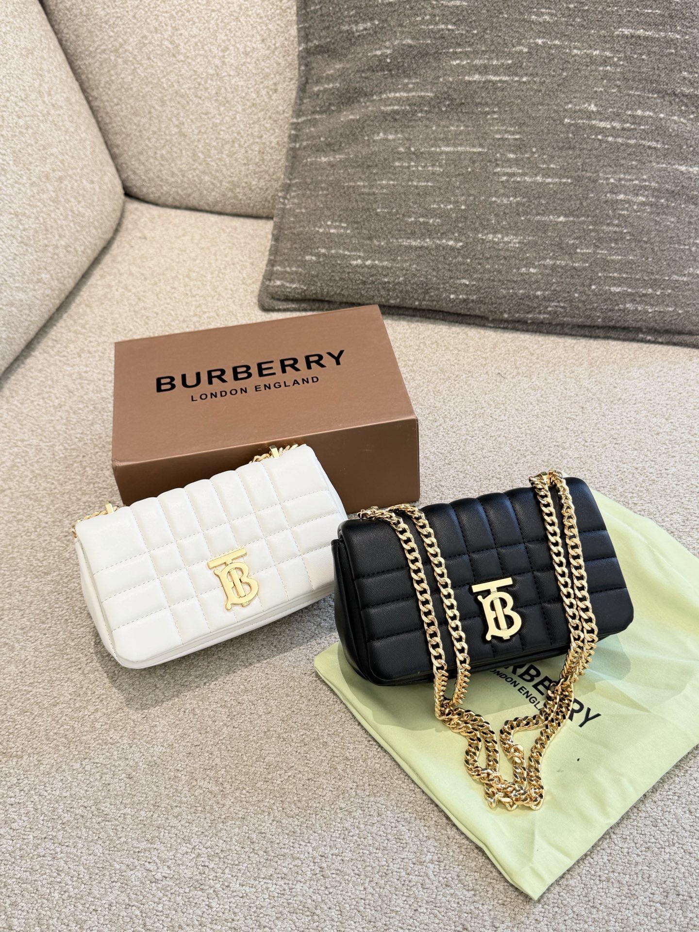 A sophisticated quilted leather shoulder bag featuring the iconic TB monogram hardware and elegant chain strap. This compact design combines Burberry’s British heritage with contemporary luxury styling.