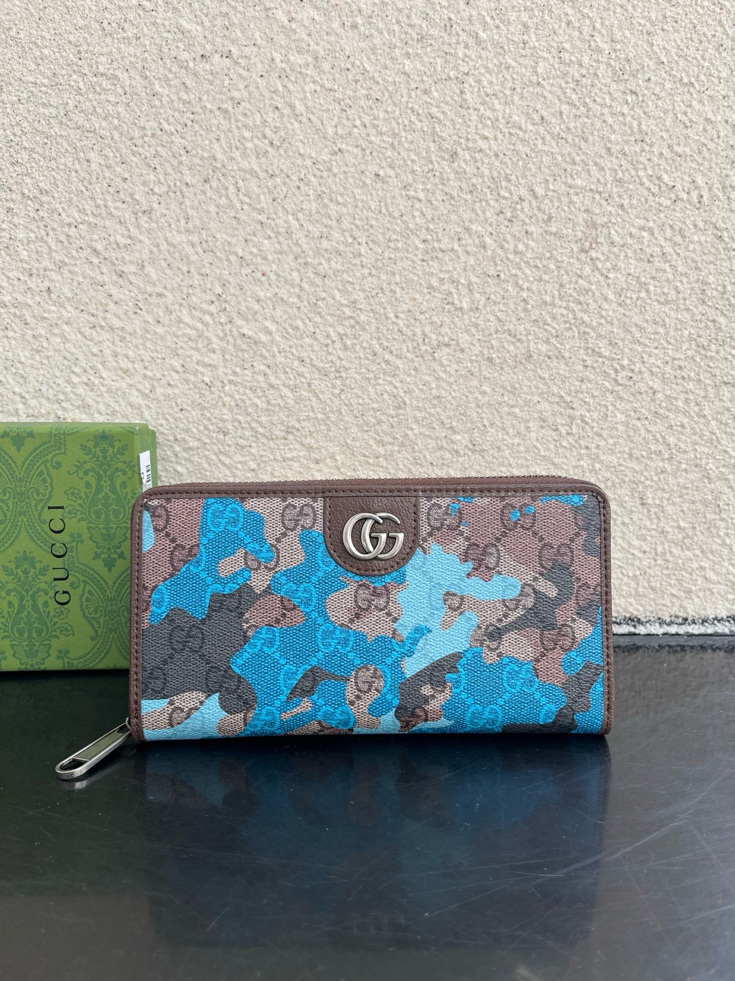 A sophisticated zip-around wallet featuring Gucci’s iconic GG Supreme canvas with a vibrant blue floral camouflage print and signature double G hardware. This statement piece combines the brand’s heritage monogram with contemporary artistic design, finished with brown leather trim.