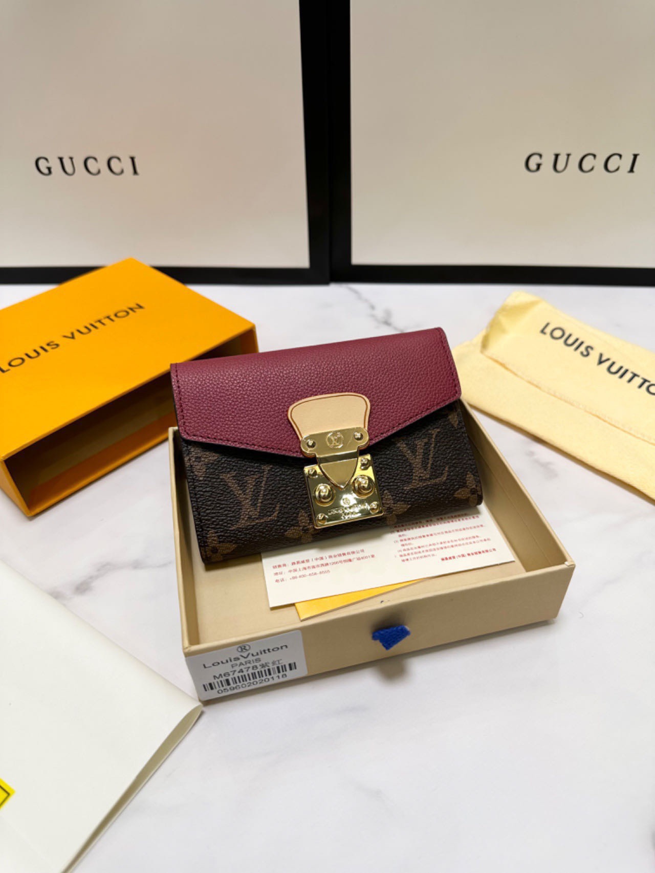 A sophisticated Louis Vuitton wallet featuring the iconic monogram canvas with a burgundy leather flap and signature gold-tone hardware lock closure. This compact accessory combines timeless elegance with practical functionality for everyday luxury.