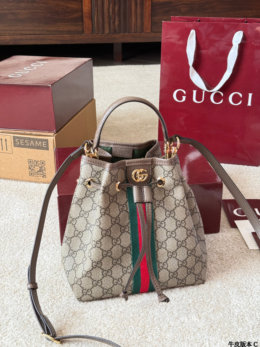 Gucci p150 Ophidia GGSupreme Logo X22 Bucket Bag. Material: Calfskin. Pattern: Monogram. Style: Crossbody, Shoulder, Backpack, Bucket. Color: Red. Includes: Shoulder strap. Size: 20 x 22 x 14 cm.