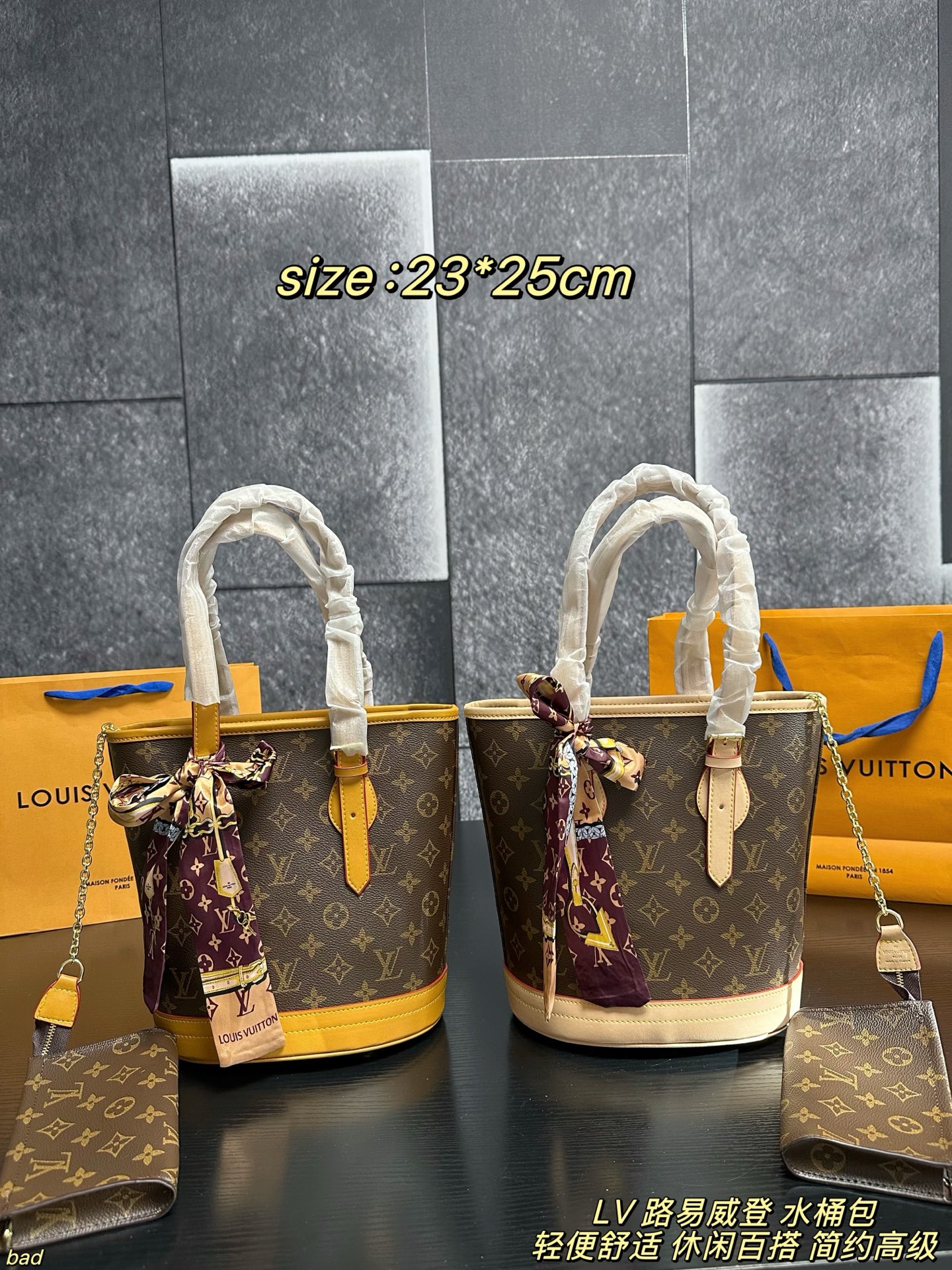 Louis Vuitton P105 Bucket 23 Bucket Bag. Pattern: Monogram. Style: Top handle, Shoulder, Bucket. Includes: Box. Size: 23 x 25 cm.