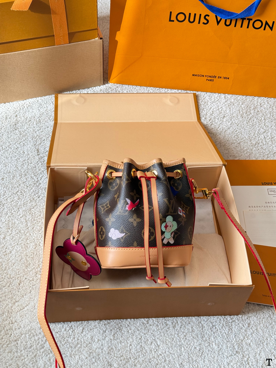 Louis Vuitton p105 Mini nano BB 15 Bag. Material: Calfskin. Hardware: Gold-tone hardware. Style: Bucket. Includes: Box. Size: 18 cm.
