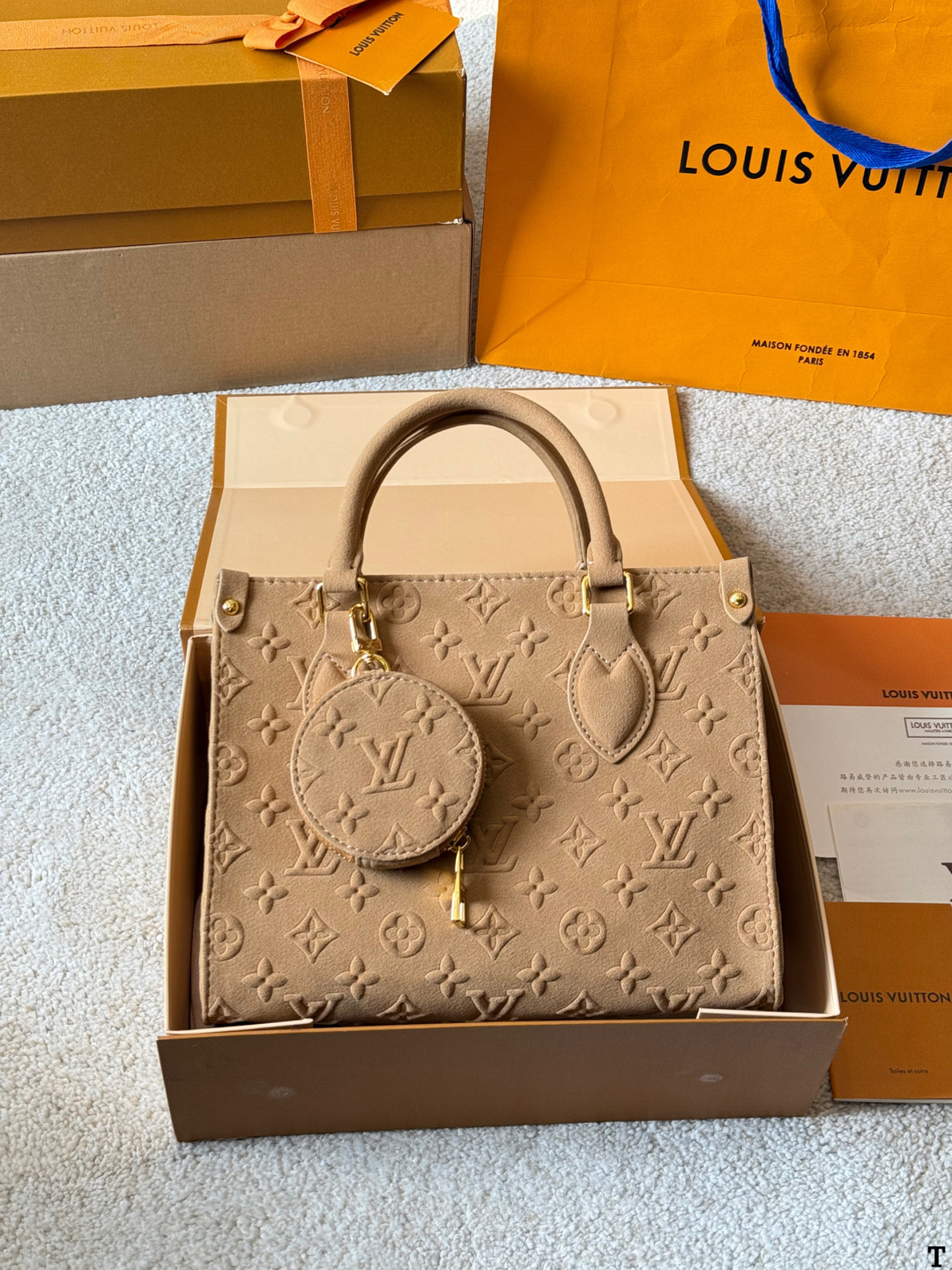 Louis Vuitton p140 Onthego VLL litton Logo Tote Bag. Material: Calfskin. Hardware: Gold-tone hardware. Pattern: Monogram. Style: Top handle, Crossbody, Shoulder, Backpack, Clutch, Tote, Bucket. Color: Black. Condition: Brand new. Includes: Box, Shoulder strap. Size: 1.9 x 1.1 x 0.2 cm.