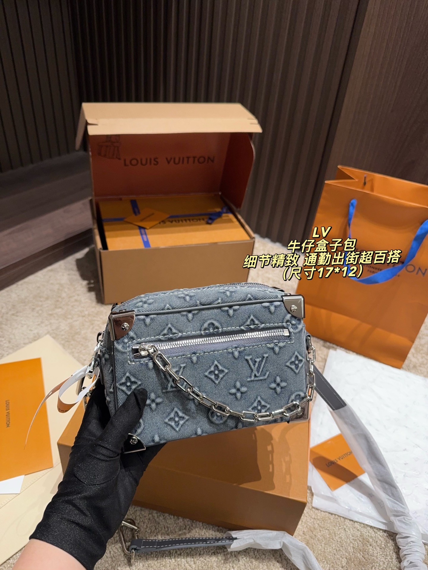 Louis Vuitton P195 17 12 Mini Soft Trunk Taurillon Monogram OK Bag. Material: Denim. Hardware: Silver-tone hardware. Pattern: Monogram. Style: Crossbody, Shoulder. Includes: Box, Shoulder strap. Size: 17 x 12 cm.