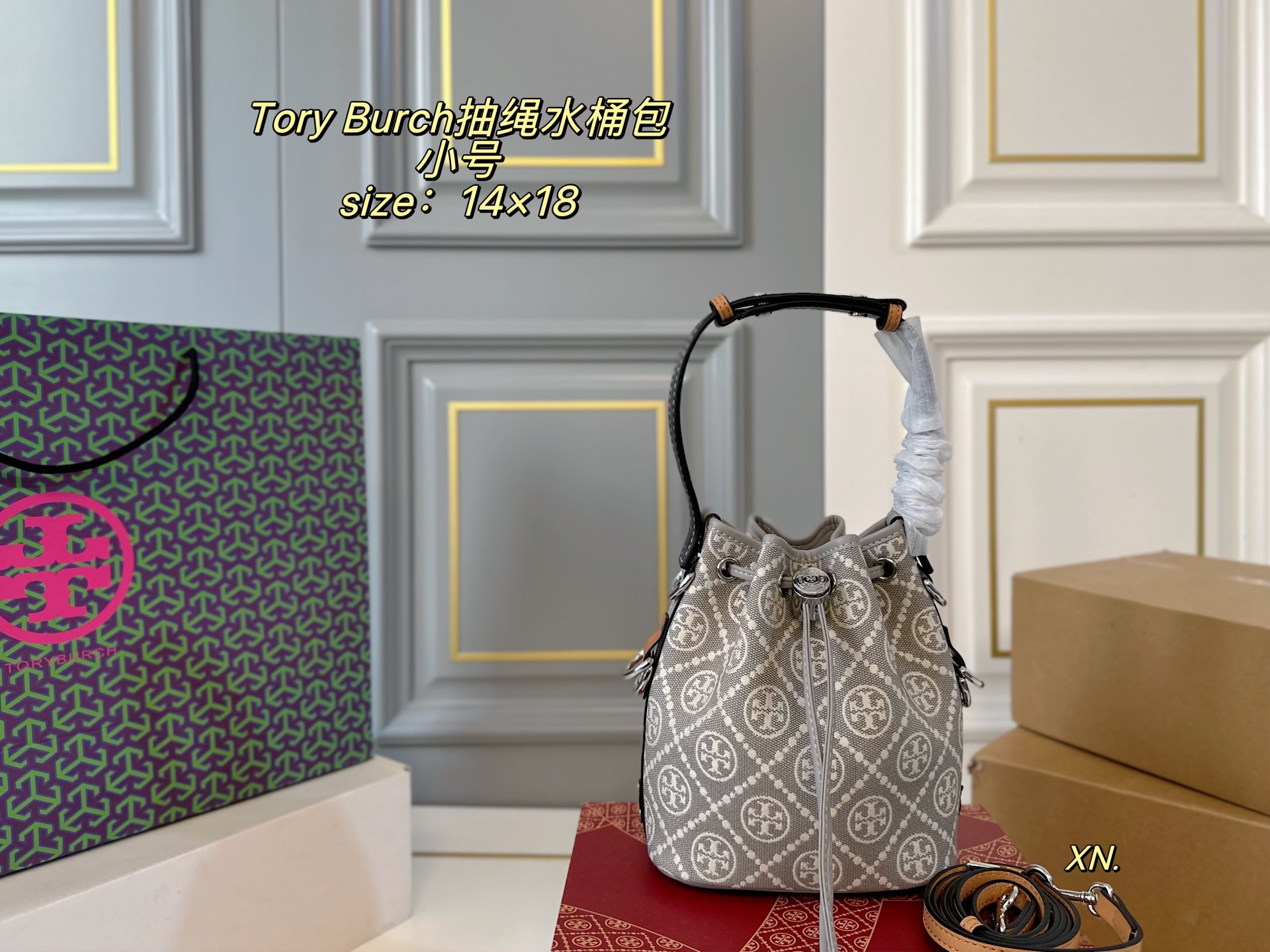 Luxury P145 size 14 18 TB Tory Burch Small Bucket Bag. Material: Canvas. Pattern: Monogram. Style: Bucket. Includes: Box, Shoulder strap. Size: 14 x 18 cm.