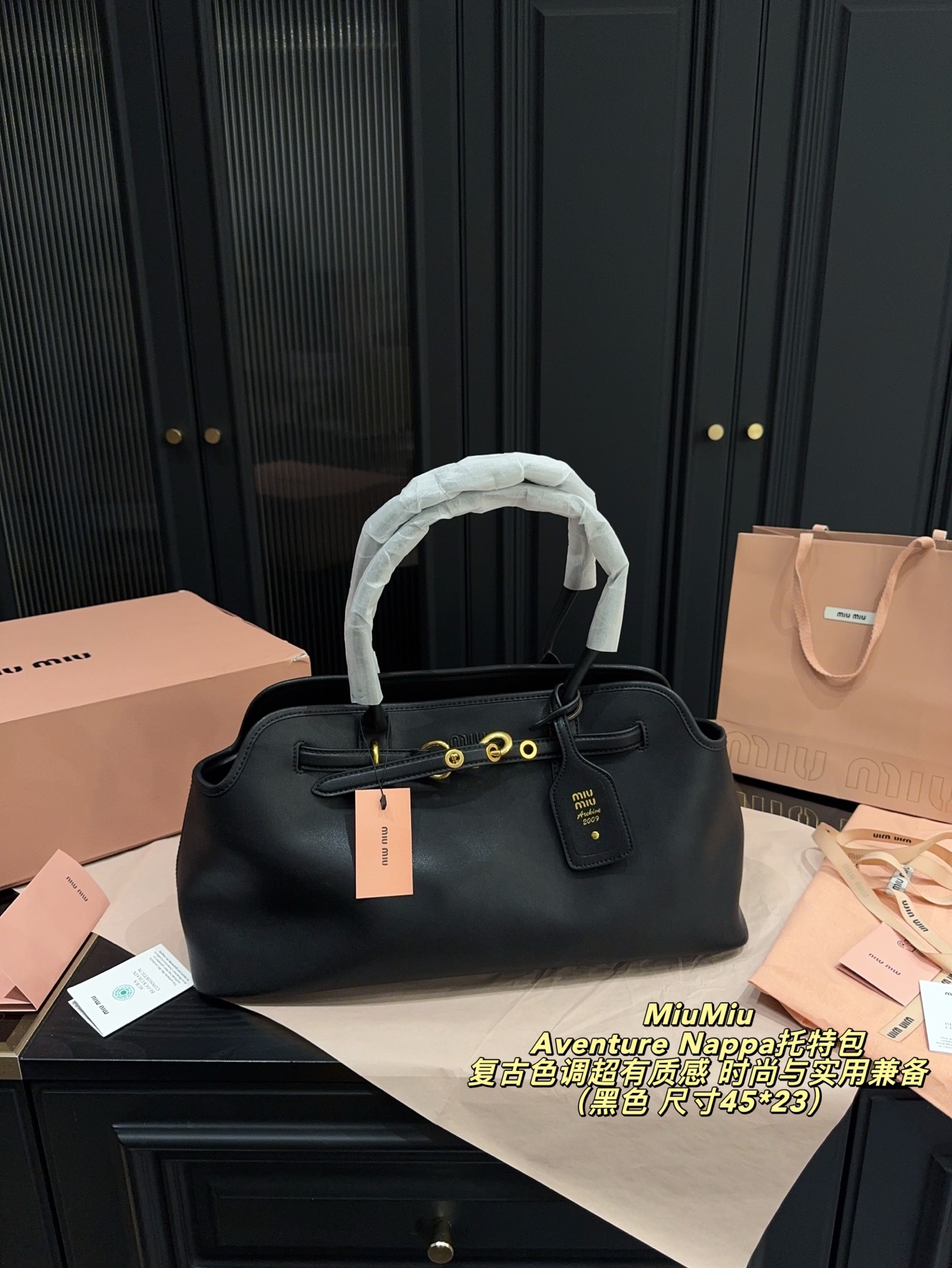 Overview: Miu Miu P225 45 23 Aventure Nappa Tote Bag. Key details: This tote bag is presented with a shopper-friendly summary based on the available listing notes and gallery details. Size & dimensions: Measurements: 45 x 23 cm. Materials: Leather. Shipping & returns: Secure hosted checkout, tracked dispatch, and a 7-day aftercare review window for delivery or wrong-item issues.